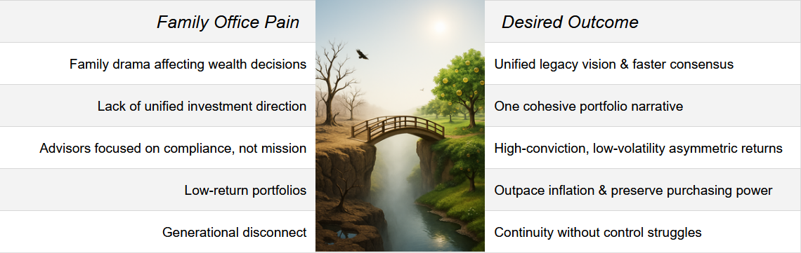 We help multi-generational families preserve harmony and compound legacy wealth — even through market chaos and internal tension.